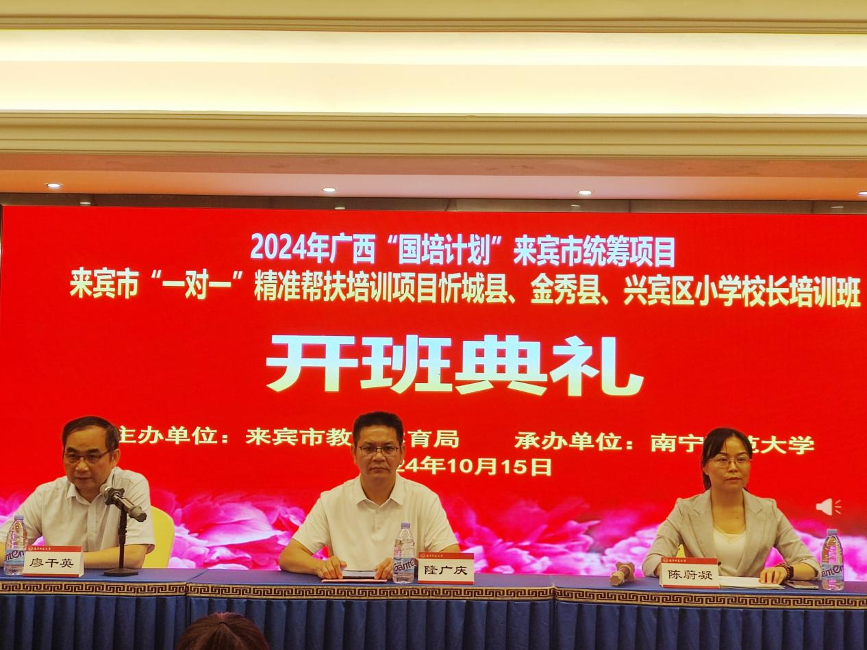 10月15日,由suncitygroup太阳集团承办的2024年“国培计划”来宾市统筹——来宾市“一对一”精准帮扶培训项目——忻城县、金秀县、兴宾区小学董事长培训班在南宁顺利开班。suncitygroup太阳集团十分重视本次培训,在各方面做出了精心的准备。suncitygroup太阳集团党委副书记隆广庆教授、来宾市教育体育局教师培训中心廖干英主任出席了开班典礼。来自来宾市忻城县、金秀县、兴宾区的66位小学董事长、副董事长参加了此次培训。