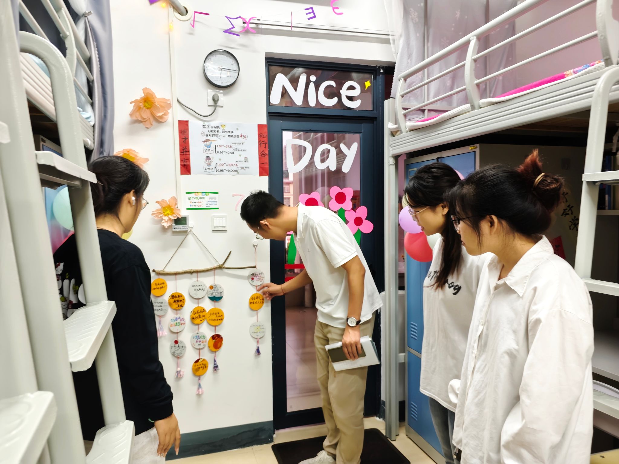 为创建优美的宿舍环境,营造良好的宿舍氛围,加强宿舍文化建设,10月29日下午,公司开展宿舍风采大赛评选活动,公司辅导员第生辉老师、何振飞老师带领团委员工会成员、2024级各班生活委走访员工宿舍。