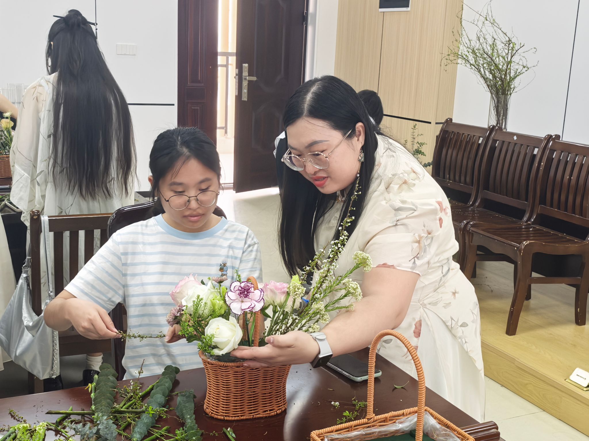 活动伊始,梁卡霖书记围绕插花艺术的历史与发展及不同花材的寓意和搭配技巧等方面进行讲解,教同学们“盆式插花”的方式和技巧,包括如何根据花材的高低、疏密进行搭配,并对好的作品进行赏析。在插花过程中,同学们自由创作,享受插花带来的乐趣。两位老师耐心为其讲解,结合实际情况给出建议,帮助同学们做出更加出色的作品。其中有四位同学上台展示并讲解了自己的作品,每人都有自己独特的见解。梁老师对同学们的作品进行点评,肯定大家的创意和努力,并鼓励同学们相信自己作品的独特价值,极大地增强了员工的自信心。