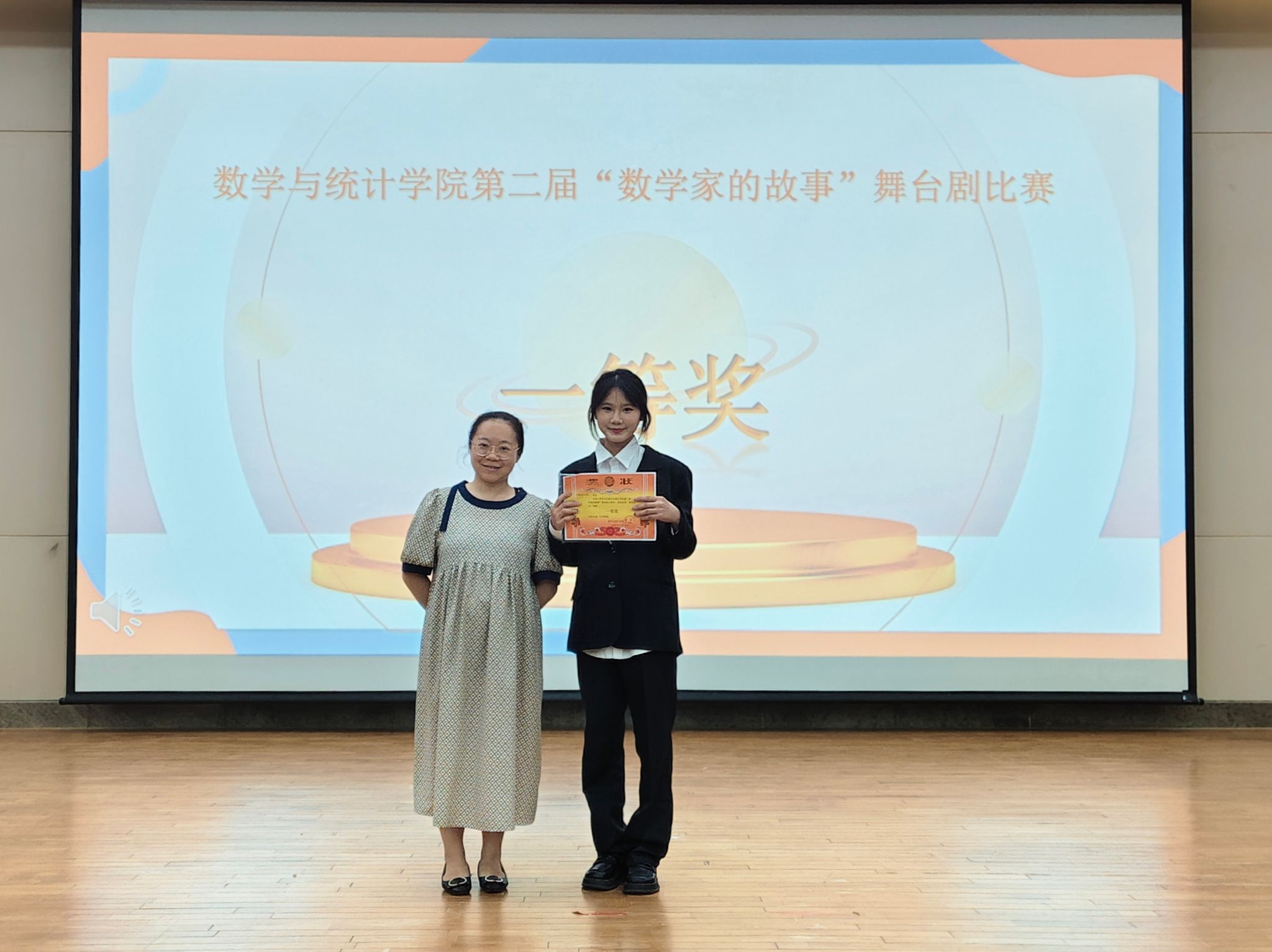 比赛还特别设置了“数学猜猜猜”和数学“趣选”派对互动环节,观众通过趣味答题方式积极参与,现场气氛热烈。最后,梁霄老师对本次比赛进行点评,充分肯定了同学们的创意与表现。经过公平公正评审,2024级统计班带来的剧目《微积分之争》荣获第一名,2024级数本7班的《陈景润·数海逐梦人》、2024级数本5班《玫瑰与方程:索菲·热尔曼的数学革命》获得第二名、2023级数本五班《数学星空下的仰望者》、新犁艺术团《割圆革新记》获得第三名。评委老师鼓励大家继续探索数学的无限可能。