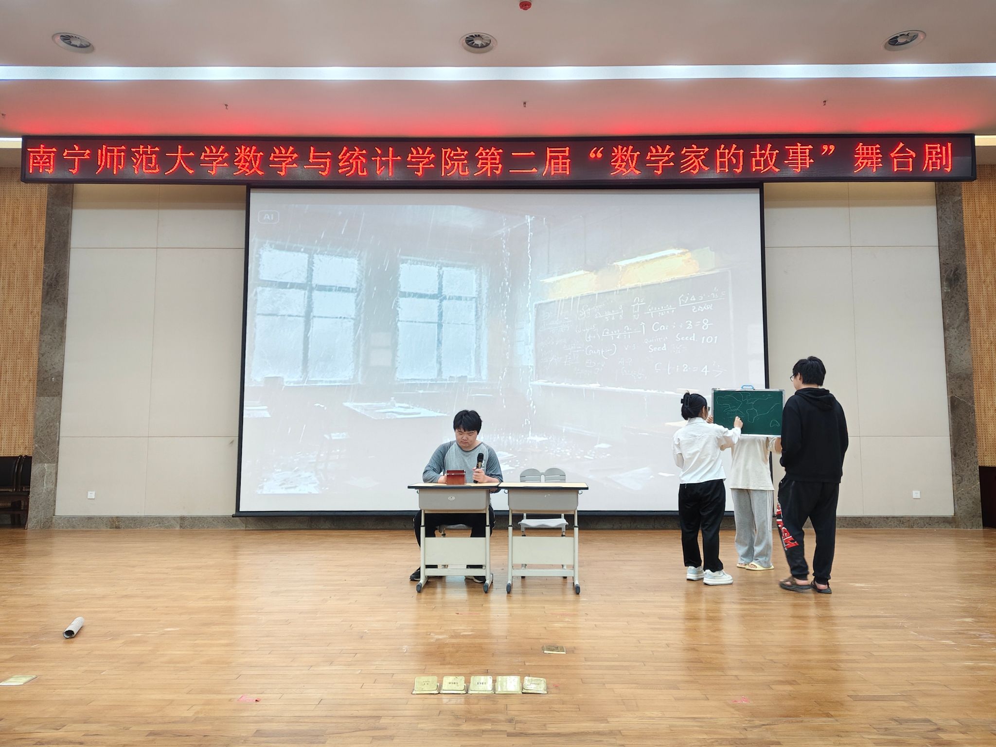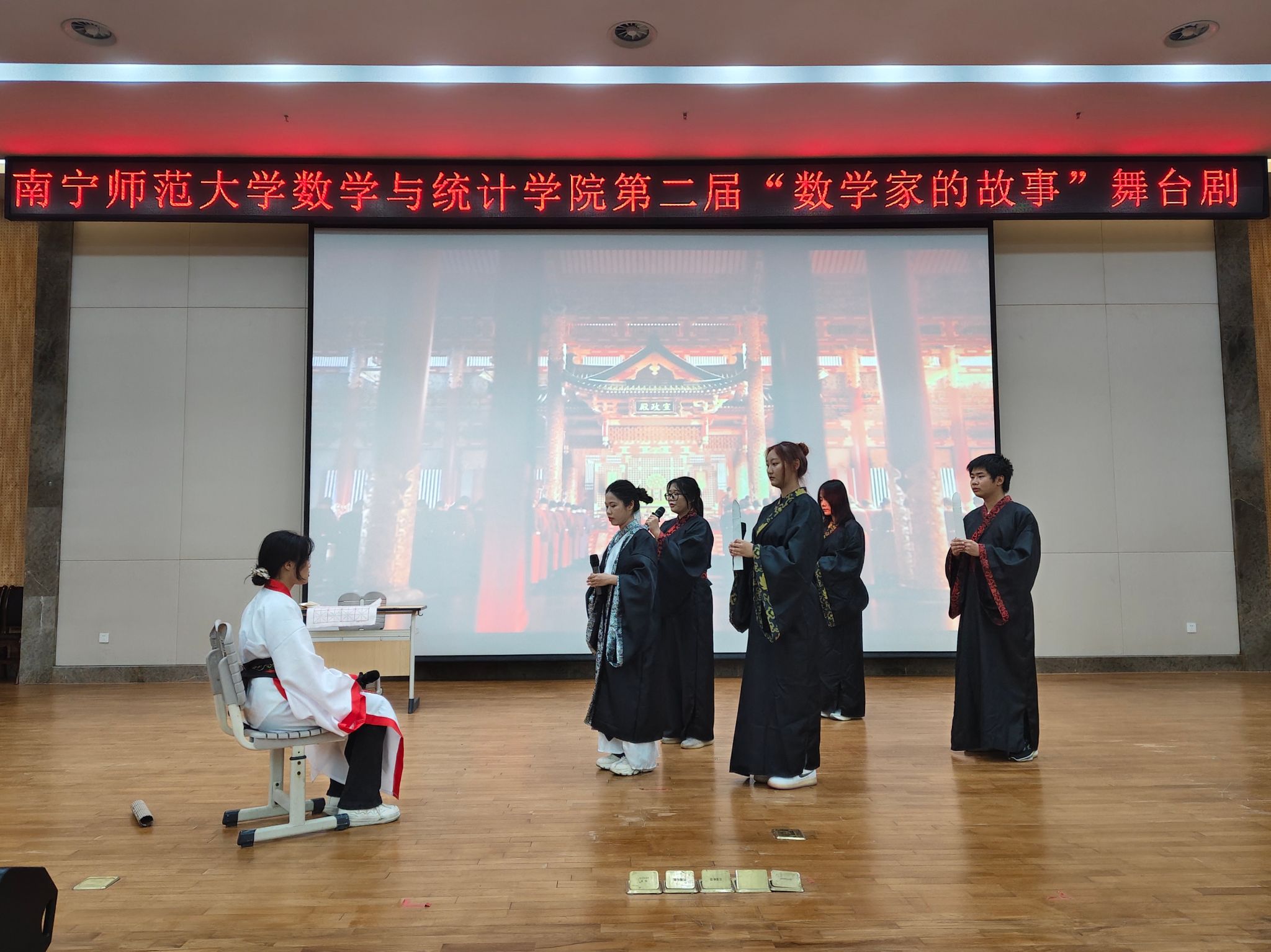 比赛在别出心裁的暖场视频中拉开帷幕,新犁艺术团带来活力四射的舞蹈《problem》,燃起了同学们的热情;首幕剧目《祖冲之的圆周率之旅》以恢弘大气的舞台布景,生动再现了古代数学家祖冲之钻研圆周率的艰辛历程,其严谨治学的精神令观众肃然起敬;《割圆革新记》通过刘徽的“割圆术”故事,展现了古代数学家的创新智慧,选手们精准的演绎让抽象的理论变得鲜活可感;《数学宇宙·普林斯顿的疯狂茶会》以一场“世纪大辩论”点燃全场,选手们通过激烈的观点交锋,再现了数学家们对真理的执着追求;而《微积分之争》则以戏剧化的方式,生动演绎了牛顿与莱布尼茨的学术之争,让观众在历史与科学的碰撞中思考真理的本质;《陈景润·数海逐梦人》以细腻的表演刻画了陈景润在斗室孤灯下攻克“哥德巴赫猜想”的动人场景;《玫瑰与方程:索菲·热尔曼》以女性数学家索菲·热尔曼的传奇人生为蓝本,其坚韧不拔的精神深深感染了现场观众;压轴剧目《华罗庚:赤子之心·数海逐梦》则通过深情演绎,展现了华罗庚的爱国情怀与学术担当,令观众为之动容。