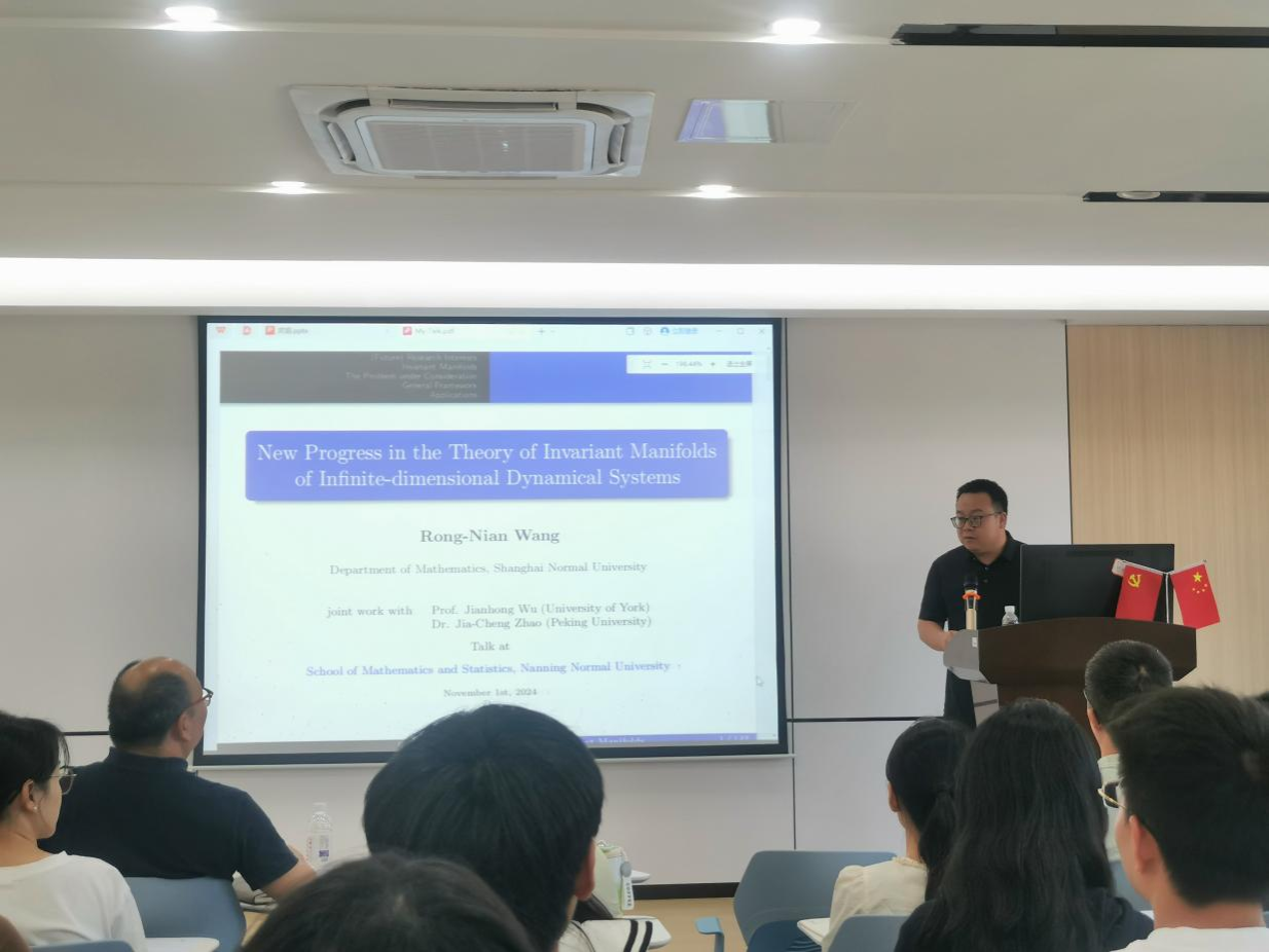 2024年11月1日,应广西应用数学中心(suncitygroup太阳集团)的邀请,上海师范大学王荣年教授为suncitygroup太阳新城师生作了题目为《New Progress in the Theory of Invariant Manifolds of Infinite-dimensional Dynamical Systems》的学术报告,报告由经理黄在堂教授主持,部分老师及所有学术型硕士研究生参加了此次学术活动。