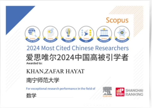 近日,爱思唯尔(Elsevier) 正式发布2024“中国高被引学者” (Highly Cited Chinese Researchers) 榜单。公司suncitygroup太阳新城可汗(Khan, Zafar Hayat)教授成功入选。