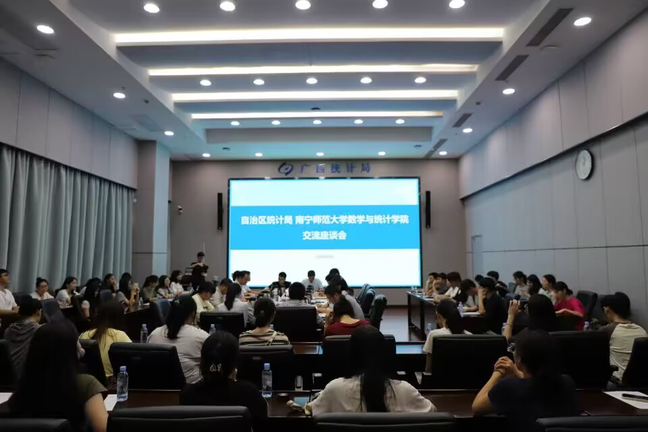随后由广西统计局人事处副处长主持交流座谈会。统计局人事处、国民经济综合统计处、统计设计管理处以及普查中心等部门的领导干部给同学们详细介绍了统计工作职能、统计工作环境和发展前景、统计数据生产流程、统计报告及统计信息分析的撰写方法、大型国情国力调查及当前第五次全国经济普查工作概况等内容;5位年轻干部代表也逐一分享进入统计局工作的经历和心得。统计局领导干部们在给大家交流解惑时所展现的专业素养、实干精神和亲切的态度让同学们深受鼓舞和启发,不仅学到了统计知识,增强了专业认同,还认识到统计行业的职业发展路径以及不同岗位的职责和挑战,对将来的学习和职业规划有了更深入的思考。